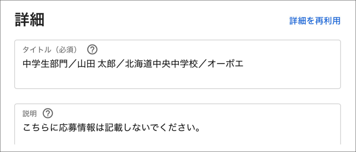 (4)タイトルに[部門名][氏名][学校名][楽器名]を入力