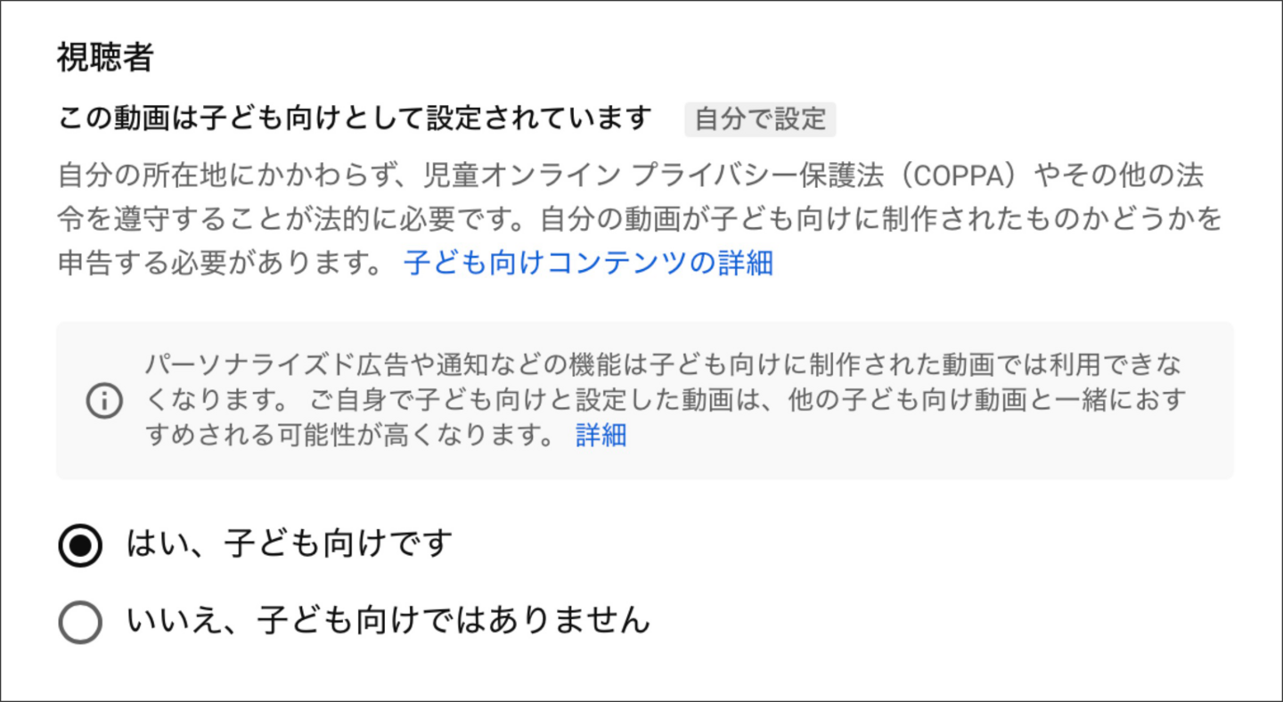 (5)視聴者の「はい、子ども向けです」を選択し、右下の「次へ」をクリック